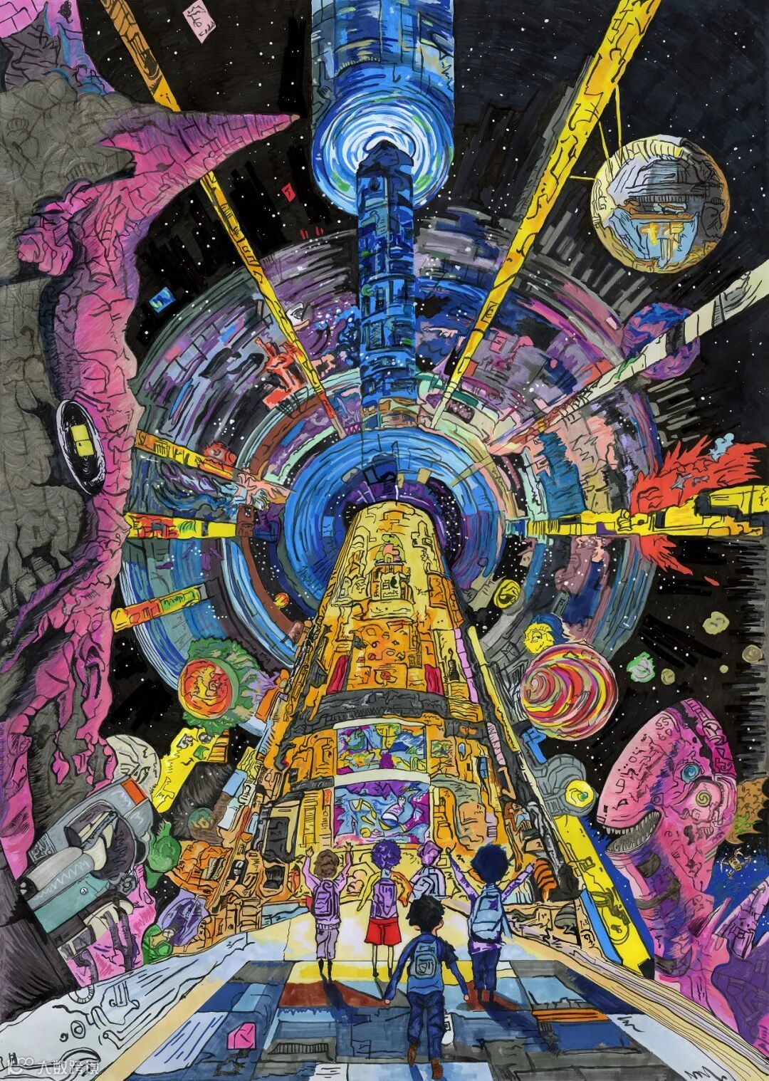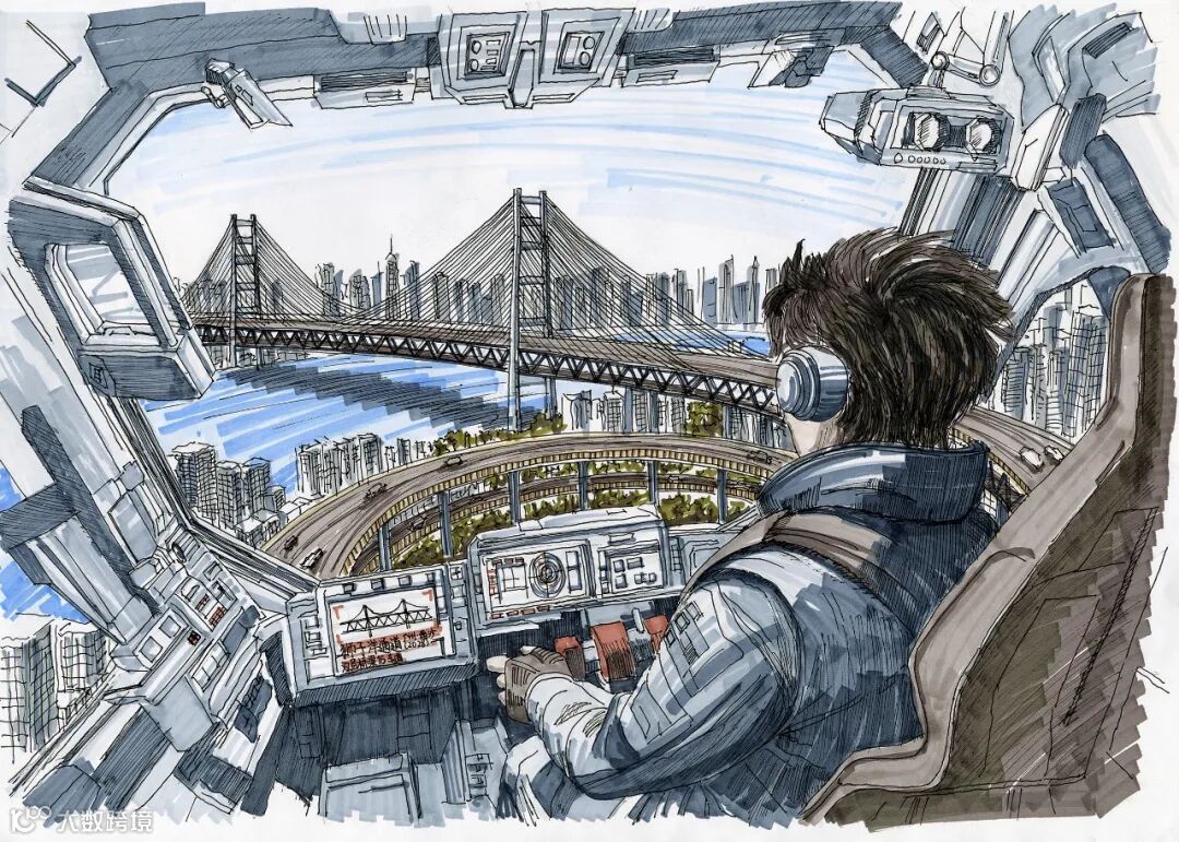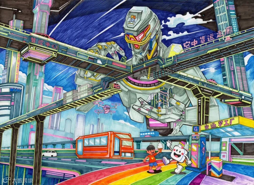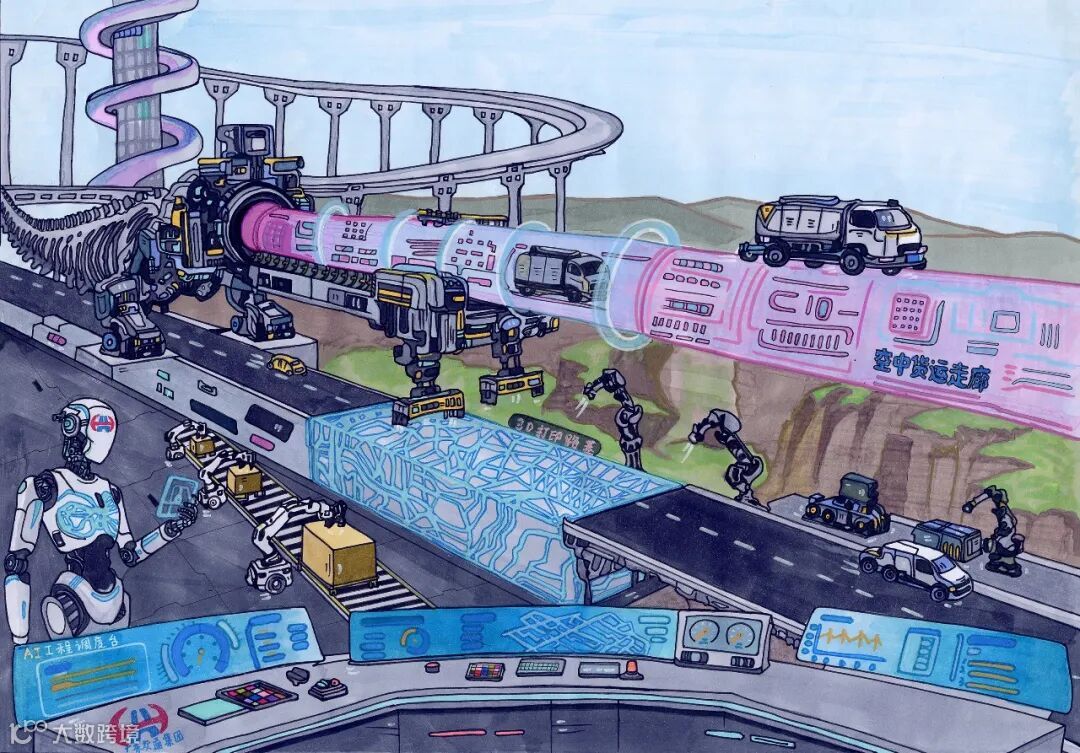 作品以马克笔勾勒智慧交通蓝图,融合空中货运走廊、机械巨兽、3D打印路基等元素,表达对未来智慧交通时代的畅想。