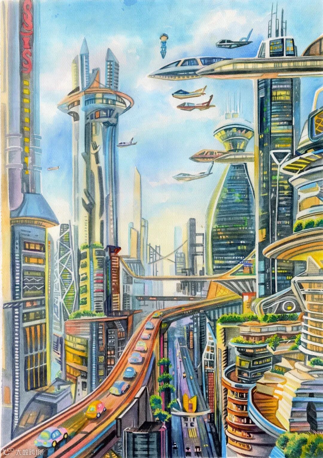 作品以未来都市交通场景为题材,表达对未来城市交通高效多元发展的畅想,以及对科技与生态、建筑共生的美好愿景。