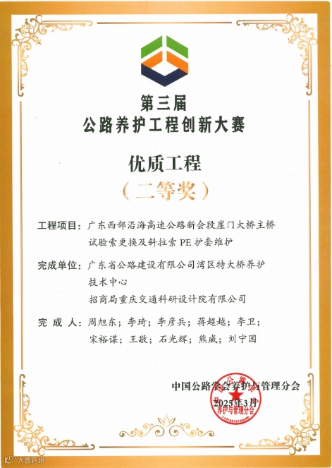 3月20日,由中国公路学会主办的中国公路学会养护与管理分会“第十四届学术年会”在江西南昌召开。技术中心申报的“广东西部沿海高速公路新会段崖门大桥主桥试验索更换及斜拉索PE护套维护”项目荣获“公路养护工程创新大赛”优质工程二等奖。