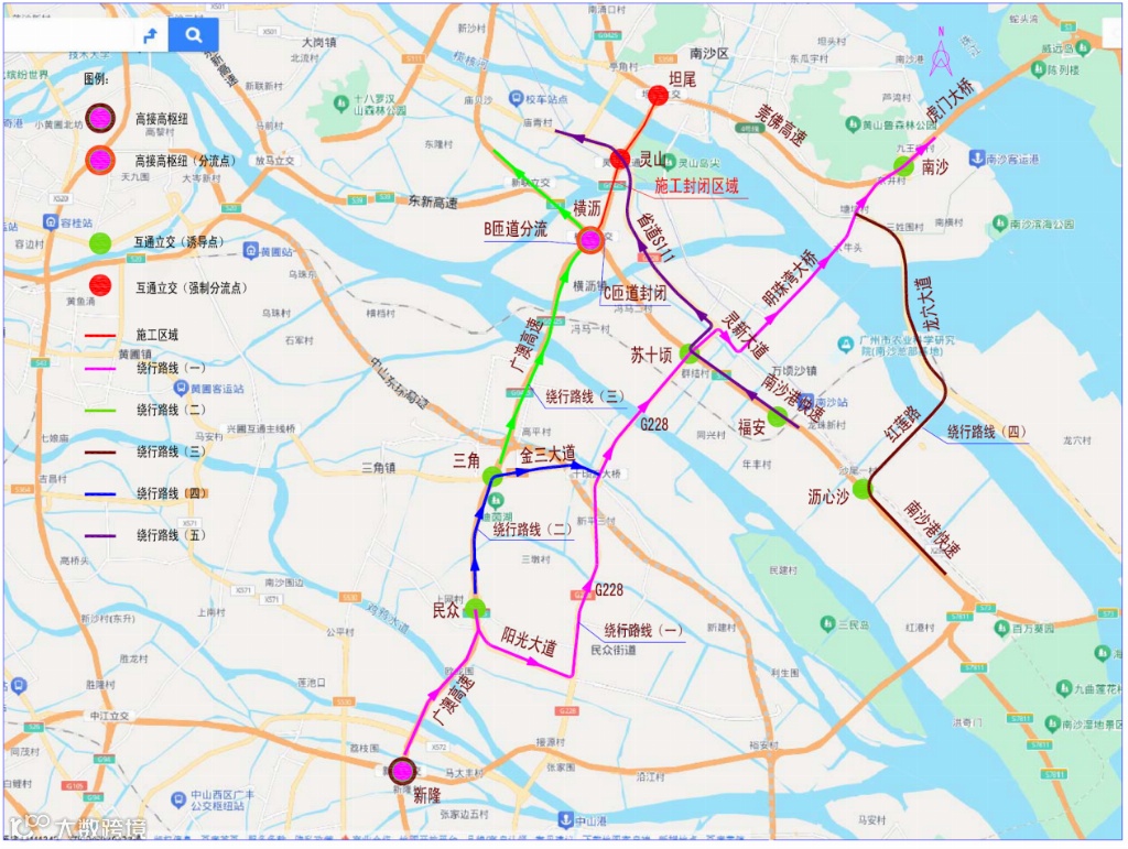 路线四:南沙大道(黄阁大道)→亭角大桥→新联互通→南沙港快速路→横沥互通→广澳高速公路珠海方向