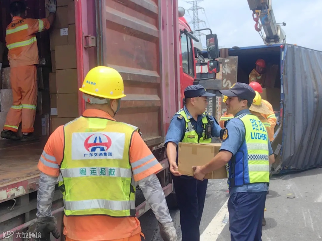 路面上热浪滚滚,转运车与侧翻货车之间短短几米路程,成了他们来回穿梭的“战场”。尽管汗水浸透了制服,皮肤被晒得发烫,现场工作人员仍没有停歇,全力以最快速度抢通路面。经过1个多小时的通力协作,200多箱货物全部被转移到转运车,货车被扶正拖走。13时20分,现场交通恢复正常通行。