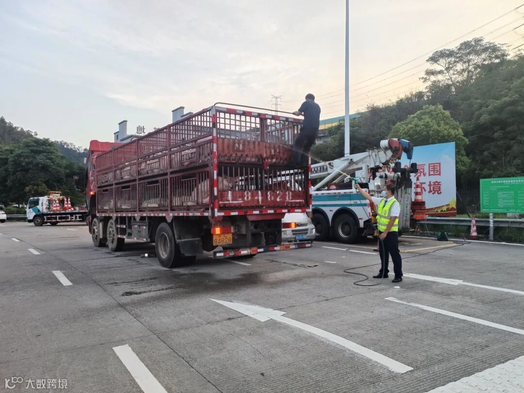 “请你们帮帮我,再晚点,我这一车猪就全完了!”7月16日18时50分,在博深高速约场站,一辆生猪运输车停靠在站场外广场,司机焦急地向工作人员挥手求助。透过车厢栅栏,收费班长何祥福发现车上30头生猪瘫倒在地,有的急促喘息,有的四肢抽搐。
