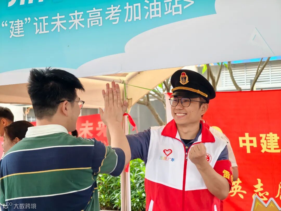 志愿者与考生击掌为其加油