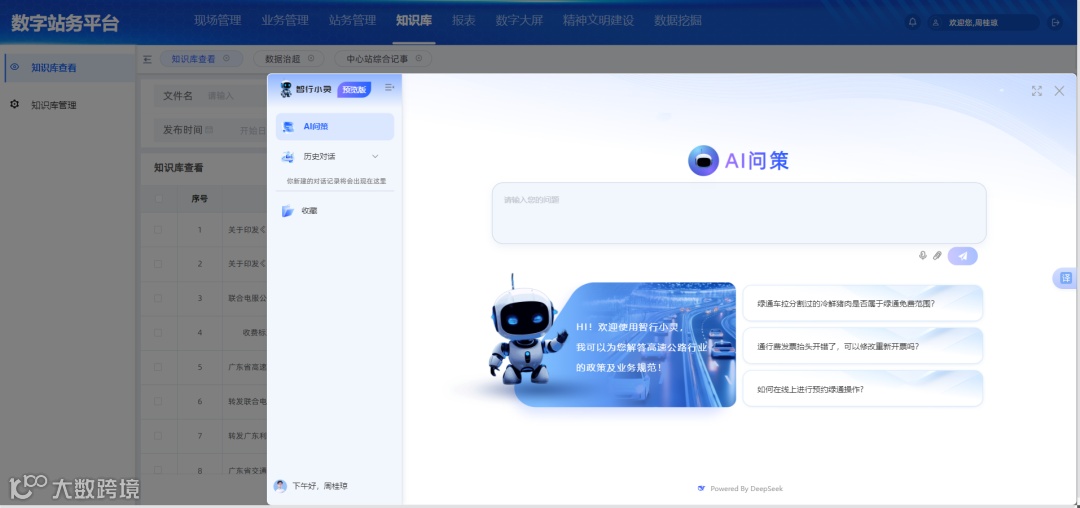 为深入挖掘数字潜能,项目团队积极探索收费站数字化转型新路径,成功搭建《收费业务知识库》,支撑各个收费站业务场景的快速查询应用,司乘人员扫二维码即可了解相关政策依据;引入DeepSeek人工智能技术实现AI智能问策,“智行小灵”如同24小时在线“AI导师”,当工作人员遇到特殊车辆处理和政策变动等复杂场景时,“智行小灵”可实时答复处置流程、政策依据及操作指引,实现业务管理效率、车辆通行效率双提升。