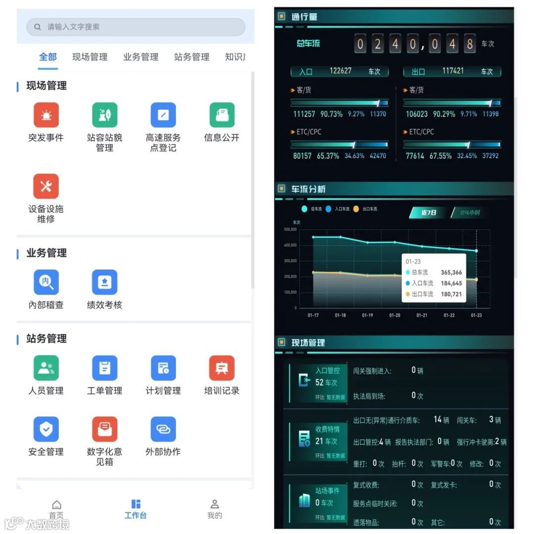 2023年,以集团科技立项为契机,公司成立项目团队,由广珠西线公司承担项目课题研究。针对传统收费站运营管理信息化、数字化水平不足等业务难题,项目团队历经两年攻关,按照“业务整合体系化、工作流程信息化、运营决策数字化、应用推广规模化”理念,通过整合收费站“现场管理、业务管理、站务管理、知识库管理、数字化报表及应用、精神文明建设”等运营管理板块,完成59项业务数字化流程再造,实现95%业务自动化生成,打造涵盖收费站全方位日常运营管理的“一掌通”门户。
