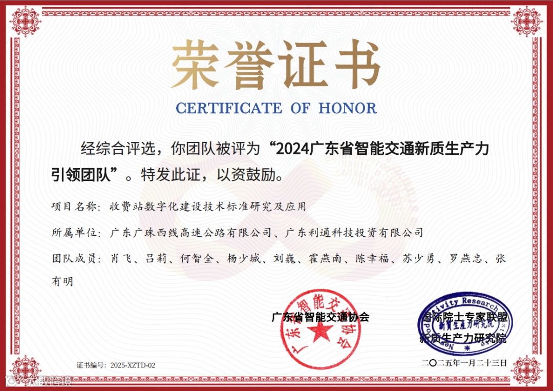 两年来,项目取得了软件著作权2项,发表论文2篇,总结形成《收费站数字化建设技术标准》(Q/GZXX BZ 20503.014-2024 ),并获得第二届交通企业智慧建设创新实践标杆案例(最高等级)、“2024广东省智能交通新质生产力引领团队”等荣誉。