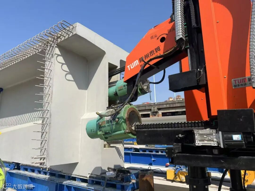 梁场共布置8条环形生产线及10个固定台座,全部投产时,单月最大生产能力约220片,大大提高预制梁片生产效率及质量。场内应用钢筋智能加工配送、液压自动模板等技术,还创新引入智能张拉机器人,可以自动定位、穿束、夹持、退锚、退顶,实现预制梁的预应力全自动张拉。