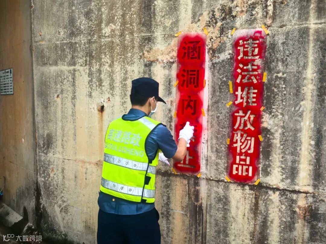 云茂高速路政员在桥下空间喷涂标语