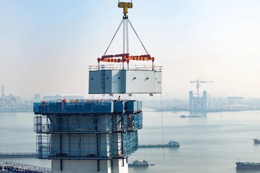 在主塔施工中,采用全球最大塔机R20000-720进行吊装工作,该塔机具备强大的起重能力和高精度的操控性能,实现了钢壳吊装的精细化控制,能将百吨钢壳安装偏差控制在5毫米内,大幅提升了施工效率和精度。