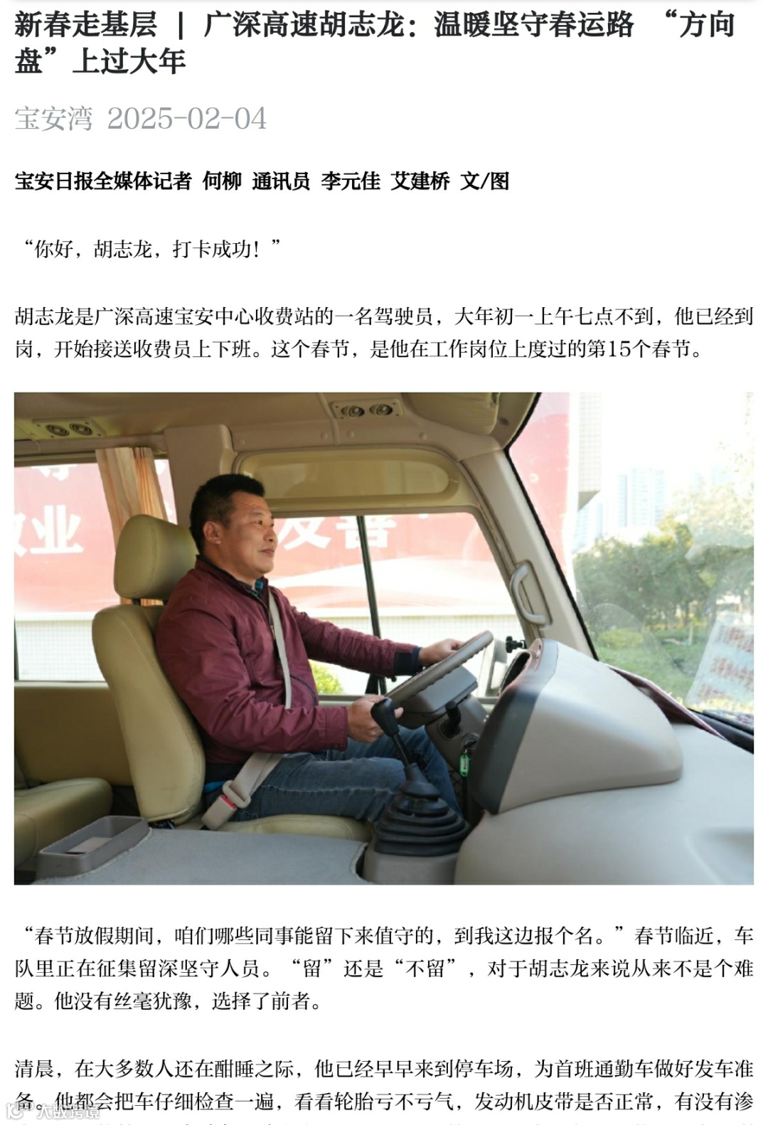 胡志龙是广深高速宝安中心收费站的一名驾驶员,大年初一上午七点不到,他已经到岗,开始接送收费员上下班。这个春节,是他在工作岗位上度过的第15个春节。