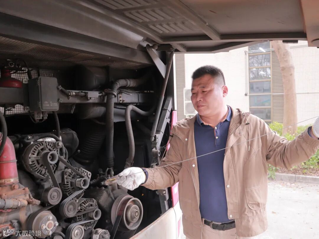 清晨,在大多数人还在酣睡之际,他早早来到停车场,为首班通勤车做好发车准备。他把通勤车仔细检查一遍,看看轮胎亏不亏气,发动机皮带是否正常,有没有渗水、漏油的情况。在确保所有部件没问题后,他又开始查看各处细节,灯光、喇叭、刹车、转向……他逐一认真查看,做到无一遗漏。