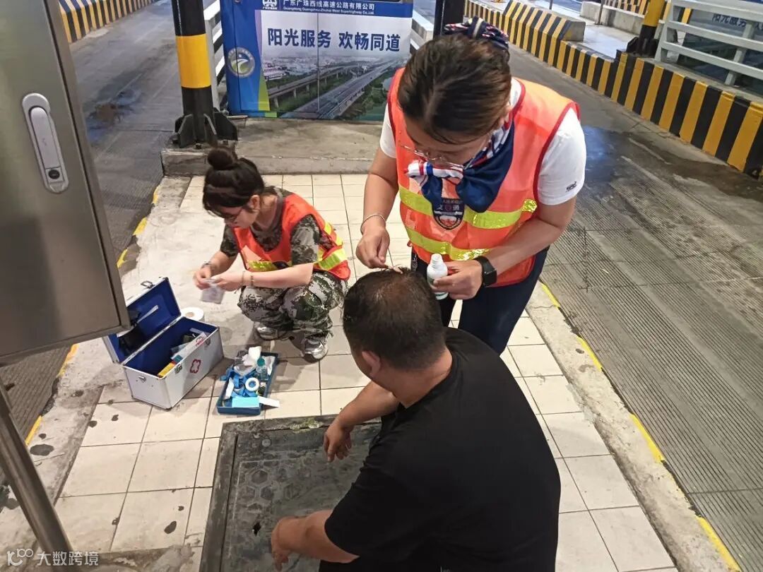 5月10日清晨5时45分,一名货车司机在广珠西线高速中山西站向当班收费员巫益娟寻求帮助,表示自己头部受伤且伤口持续渗血。巫益娟立即将情况上报监控(客服)中心,指引司机将车辆停至收费广场安全区域,并通过对讲机呼叫广场值守人员侯硕、谢珊珊到场支援。