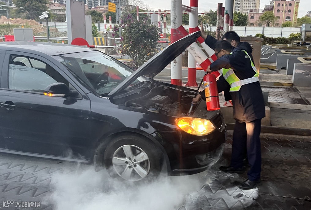 2月16日7时17分,一辆黑色小车在广深高速道滘收费站南出广场准备缴费。收费员尹小向突然发现该车引擎盖处冒出白烟,并有火苗窜出,他立即告知司机下车避险。