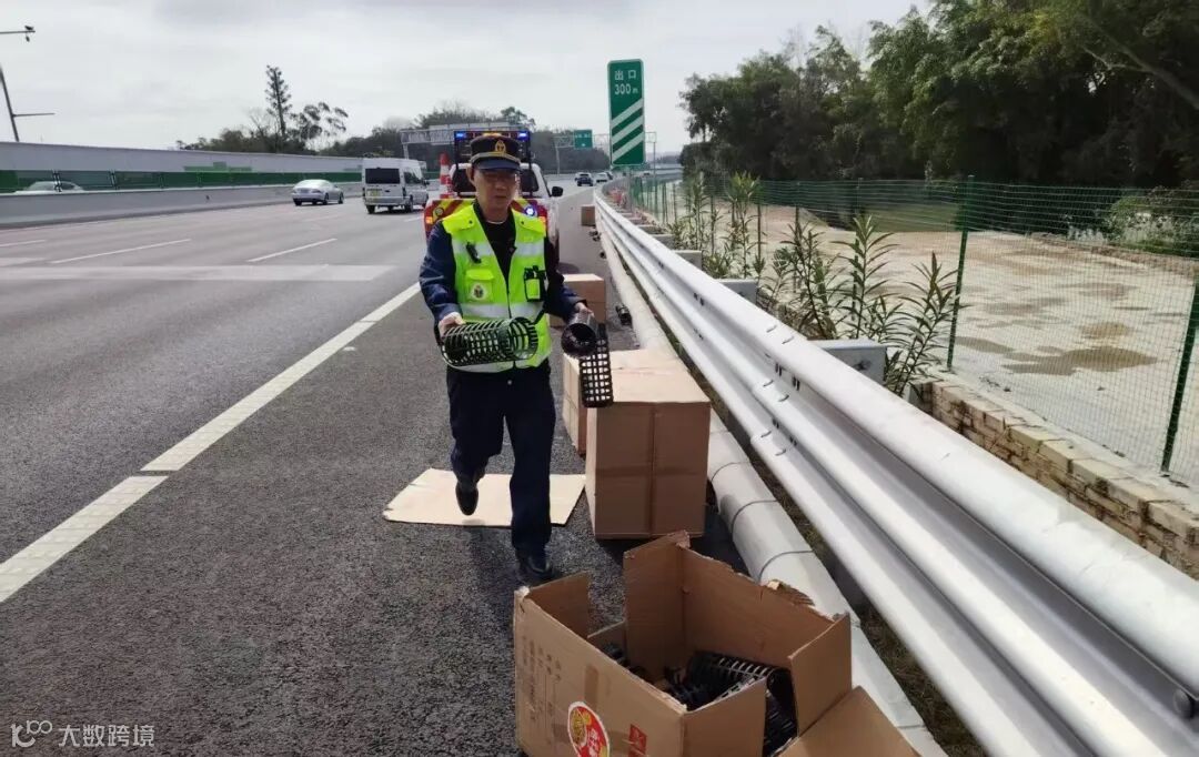 在双方协同配合下,仅用10分钟,路政员就迅速将货物搬运至路政车,随后立即解除主线围闭,现场恢复正常通行。