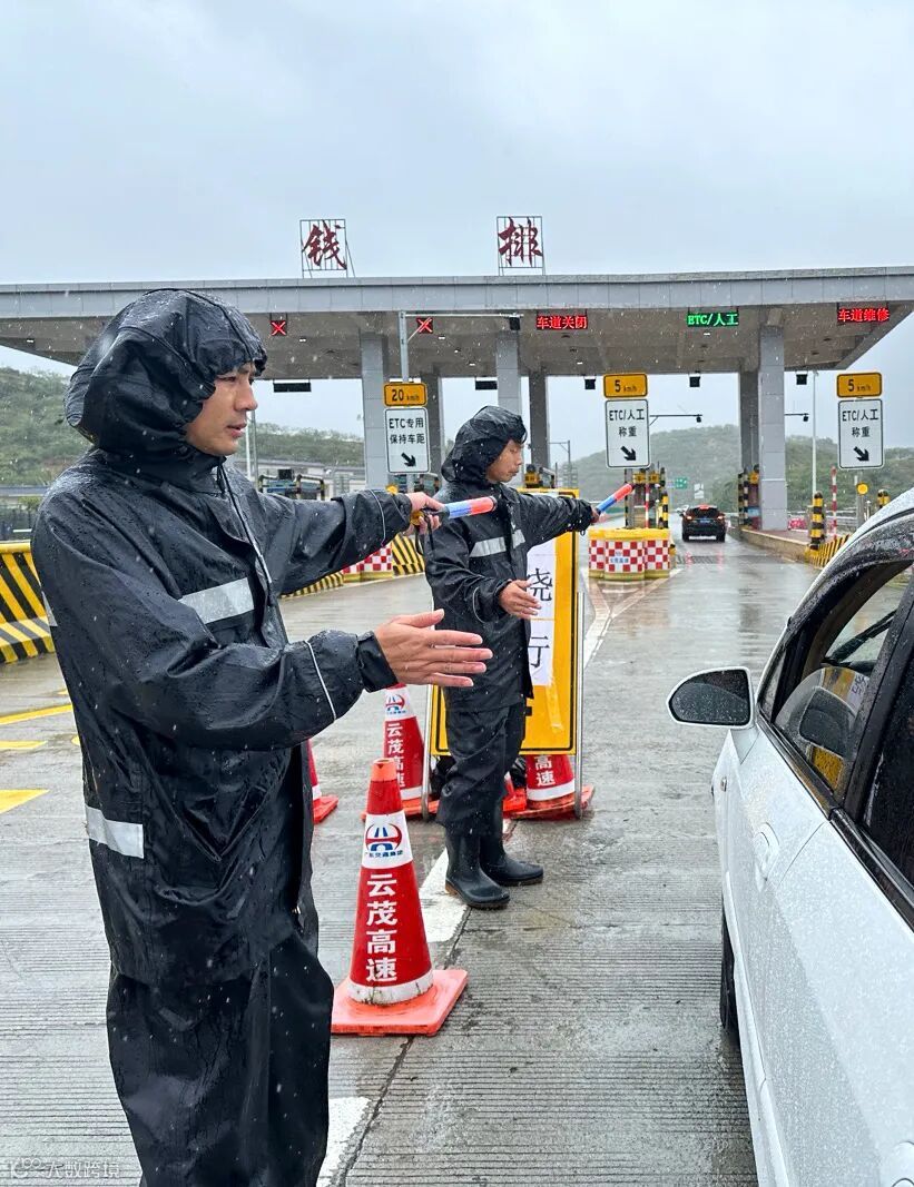 云茂高速收费员身穿雨衣在雨中指挥着交通