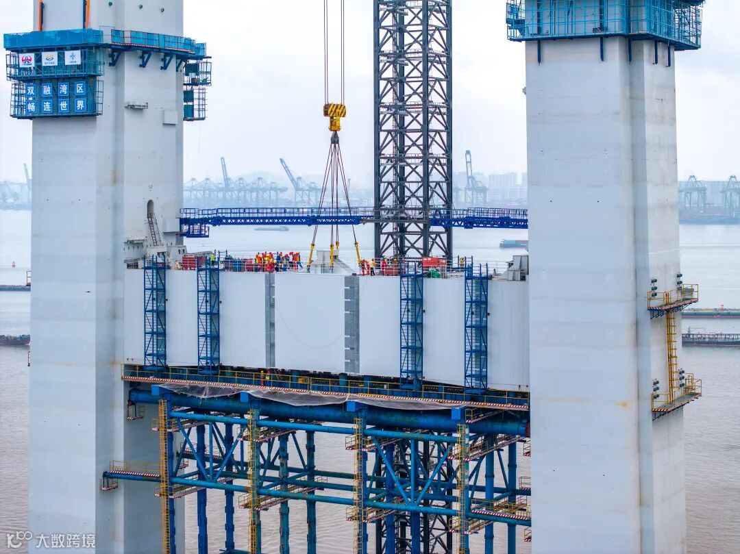 首道钢横梁架设完成后,还需要进行节段间的环槽铆钉栓接、顶板焊接等工序,实现最终合龙。目前,项目正有序推进主桥狮子洋大桥主塔建设,锚碇已完成填芯,正进行顶板及锚固系统安装施工;引桥工程逐步转入上部结构全面施工阶段。