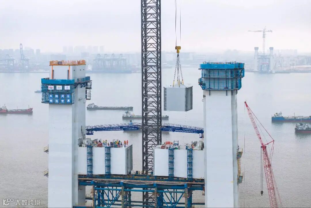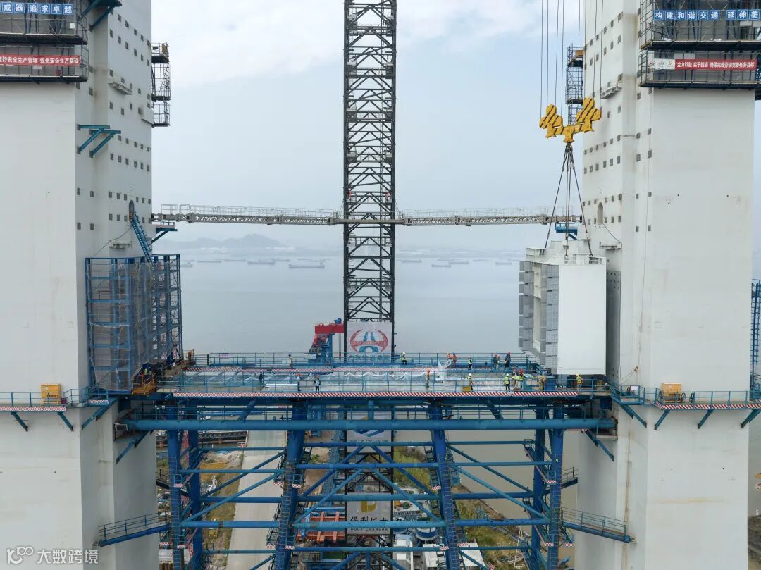 主塔首道钢横梁如大桥的“肩膀”,支撑起桥面和未来桥上过往的车辆。该横梁是全桥最重的横梁,重量超1200吨,由7个节段组成。
