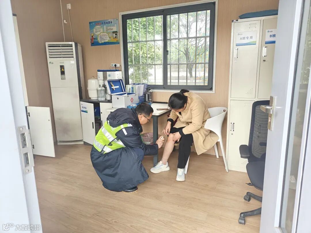 在等待过程中,女士表示她手部和腰部非常疼痛,工作人员发现女士身体似乎因惊吓和疼痛止不住地发抖,立刻为她倒了杯热水,并用应急药品小心翼翼地处理她磕碰受伤的部位。十几分钟后,女士的状态有所好转,手部能正常活动。