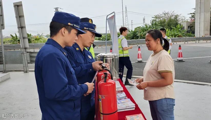 南环段分公司联合番禺消防大队在海鸥岛开展消防宣传活动,消防员为员工和过往司乘详细讲解了消防器材、防毒面罩、氧气瓶的使用方法及注意事项。