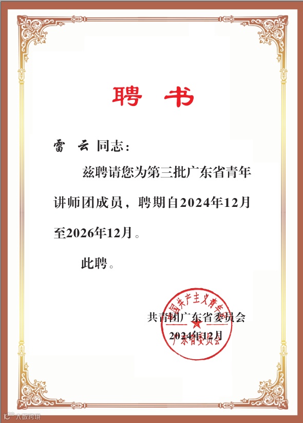 广东省青年讲师团成员均为来自不同行业和领域的优秀青年,雷云入选青年讲师团后能更好地与他们进行交流与合作,学习借鉴不同领域的成功经验与方法,拓宽视野,创新工作方法,促进团队工作效率的提高。