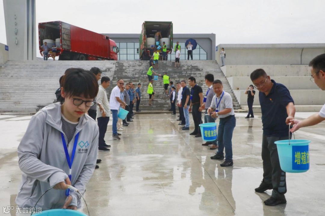 上午10点,海洋生态增殖放流活动正式开始。深中通道管理中心各支部党员代表以装载鱼苗的货车为起点,依次将鱼苗倒进在海边预设的放生通道,顺流到大铲湾海域。本次活动共放生60万尾紫红笛鲷。