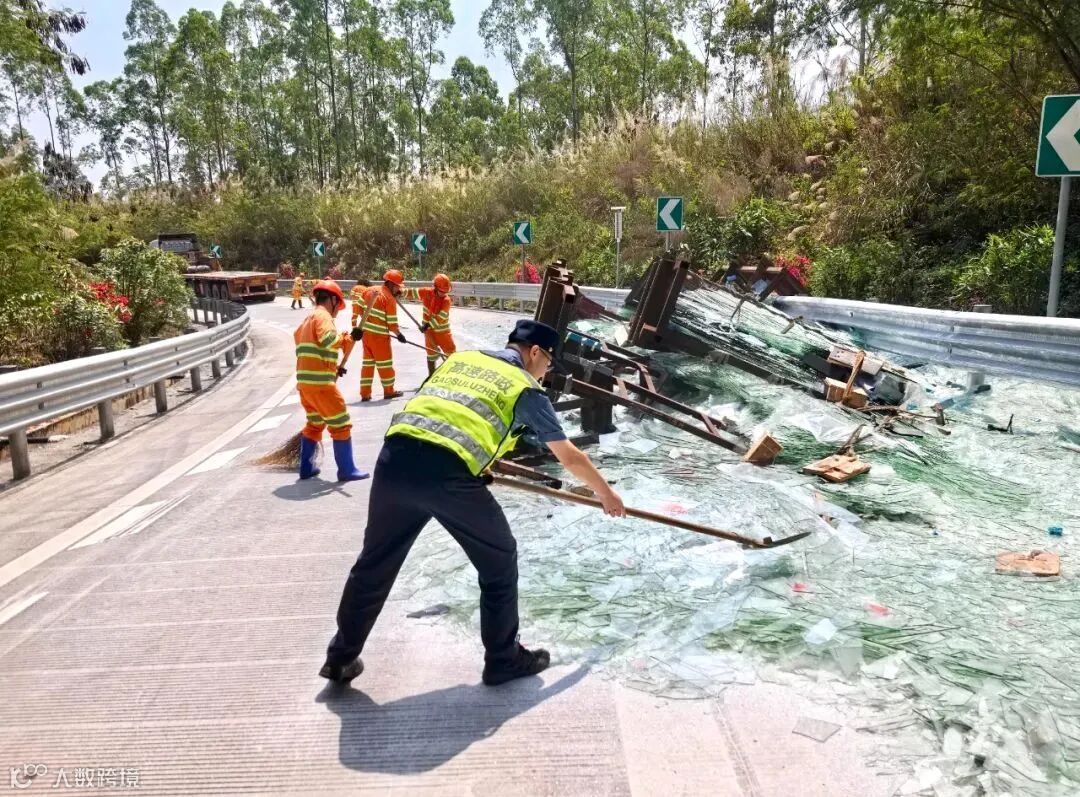 “快快快,先清出半幅通道!” 在现场,路政人员指引交通,在车流中开辟出安全作业区;养护人员手持铁铲和扫帚,将左侧主道的玻璃碎片往右侧推移;拯救人员操控车辆吊臂抓起货物架与大块玻璃进行转移。11时41分,经过连续奋战,半幅匝道恢复单向通行。