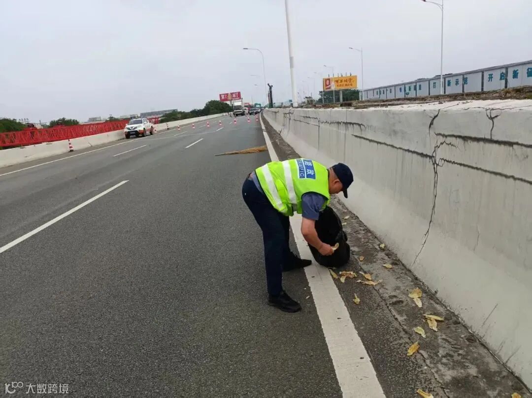 路政员邱权贵、黎智军闻讯而动,快速抵达事故现场,只见300余米长的匝道被晶莹剔透的碎玻璃覆盖,车辆一旦经过极可能引发爆胎。“不好!要立即处置!”两人随即启动应急预案,一人在匝道入口摆放反光锥桶,实施临时交通管制,指引车辆绕行至下一出口;另一人则联系养护、拯救人员调配抢险设备。一场与时间赛跑的“道路抢通战”在轰鸣的引擎声中开启。
