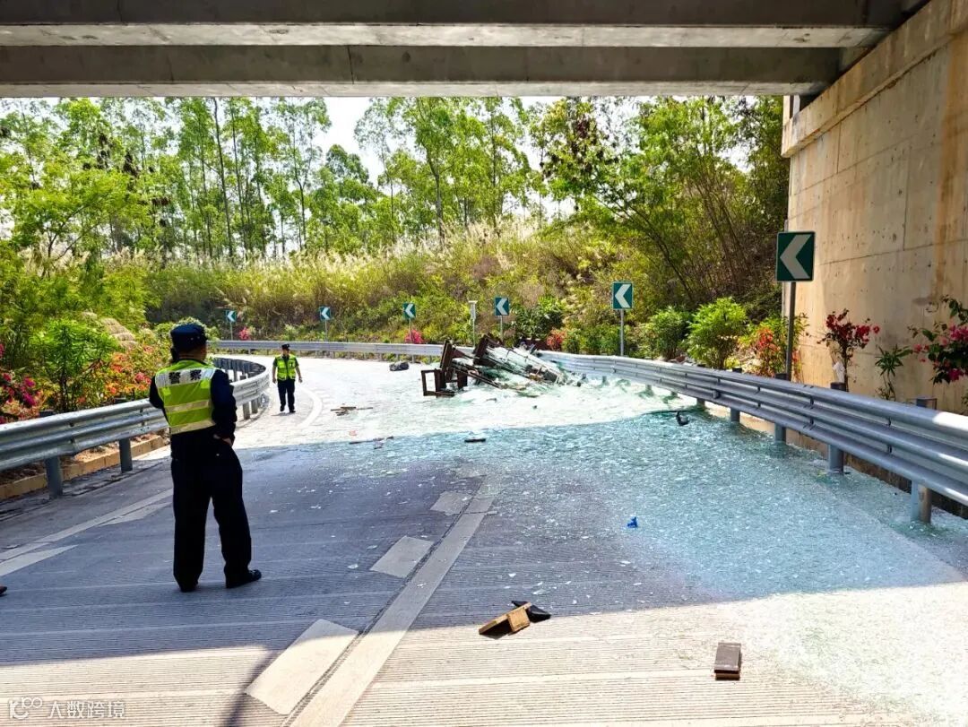 4月9日10时30分,云茂高速罗镜收费站出口匝道突发惊魂一幕:一辆满载30吨玻璃的重型货车在急弯路段因操作失误,货物架掉落,车上玻璃如下雨般倾洒一地,道路安全岌岌可危。