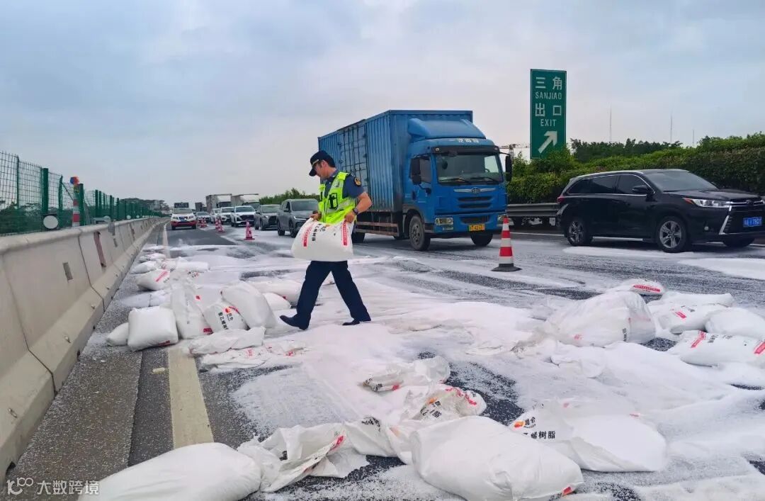 接报后,路政员吴鸿光、安文雄迅速赶到现场,发现约50包塑料颗粒散落一地,像下了一场小雪,严重影响车辆正常通行。见此情景,他们紧急封闭第二及第三车道,指挥途经车辆减速通过,并将包装较为完整的货物转移至路肩处,为快速解封争取时间。