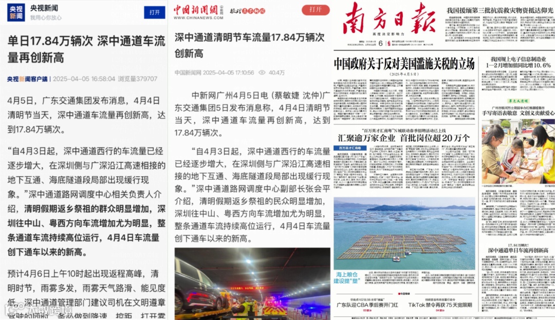 4月4日,清明节当天,深中通道车流量再创新高,达到17.84万辆次。