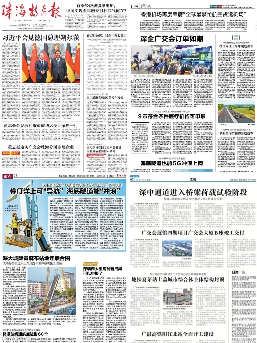 伶仃洋上,蛟龙跃海。4月16日11时30分,随着设在深中通道东、西人工岛上的大屏幕显示视频实时连线,深中通道全线5G通信网络通过验收,正式实现“网联通”。