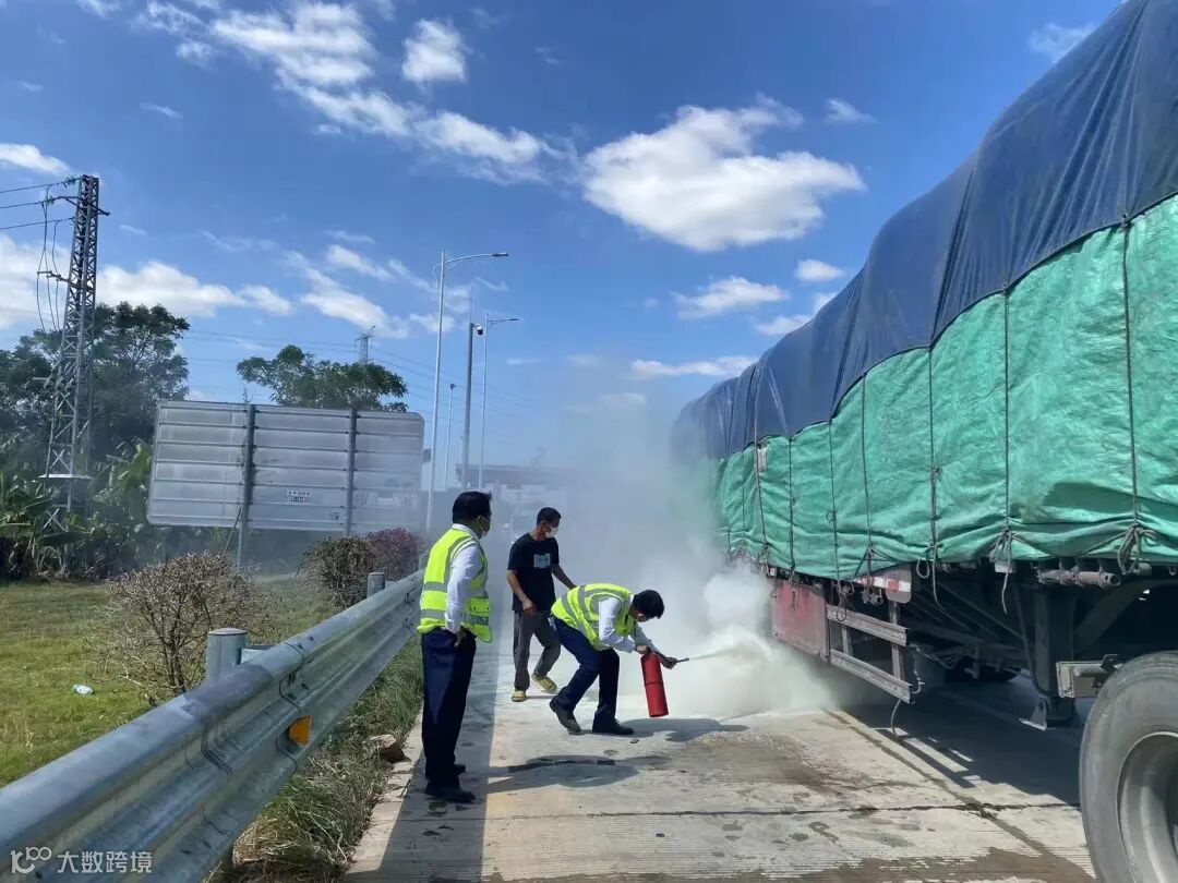 “我车上装的都是易燃的日用品,车上没有灭火器,请你们帮帮我!”司机求助道。杨秋莹一边安抚司机,一边组织工作人员分工合作,开展救援。她与工作人员叶华昌做好现场安全围蔽,指引过往车辆有序通过;工作人员陈启斌拿起灭火器跑向货车,对准起火点进行灭火。