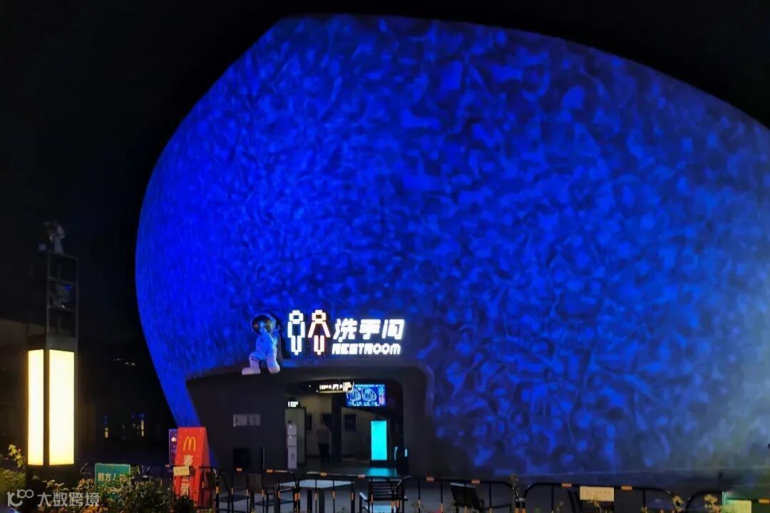 洗手间门口摆设了太空人的卡通形象,夜间配以水纹灯外墙投影,在洗手间墙面涂画了天空星月图,让人感觉仿佛遨游于太空之中。