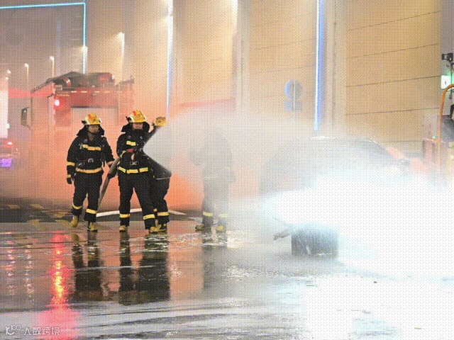 “119火警中心,这里是广深高速新塘站,南出广场有一辆新能源小车与一辆空载中型货车发生追尾,新能源车辆着火,请迅速支援!”