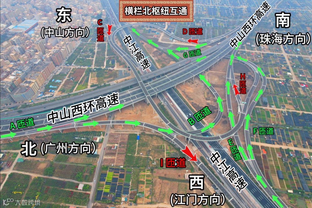 中江高速与中山西环高速相接的横栏北枢纽互通,是中山市古镇镇、横栏镇对外交通疏导的重要互通。此次开通的4条匝道分别为:E、F、B、G匝道。