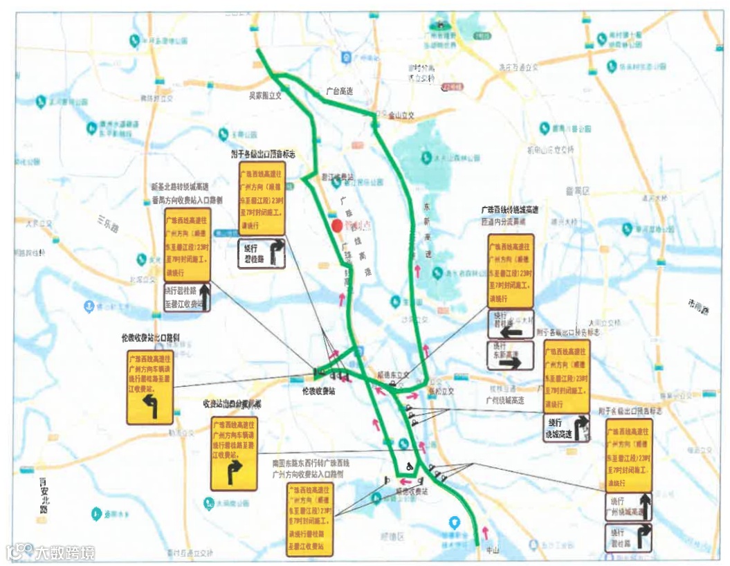 管制措施一:夜间(23:00-07:00)封闭广珠西线高速广州方向半幅交通(顺德东至碧江路段),同时封闭珠海方向超车道,广珠西线高速往广州方向交通进行绕道。具体绕行路线如下: