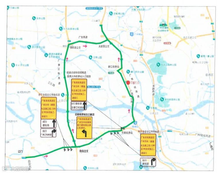 广珠西线高速广州方向封闭期间交通绕行路线示意图
