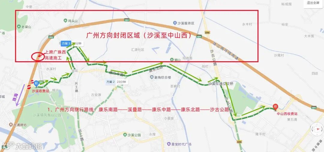 实施封闭管制,封闭沙溪互通广州方向主线交通,引导车辆从沙溪收费站驶出;禁止车辆从沙溪收费站进入往广州方向通行。