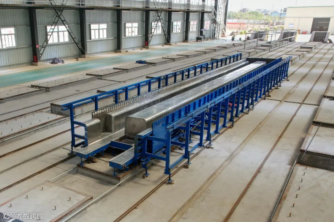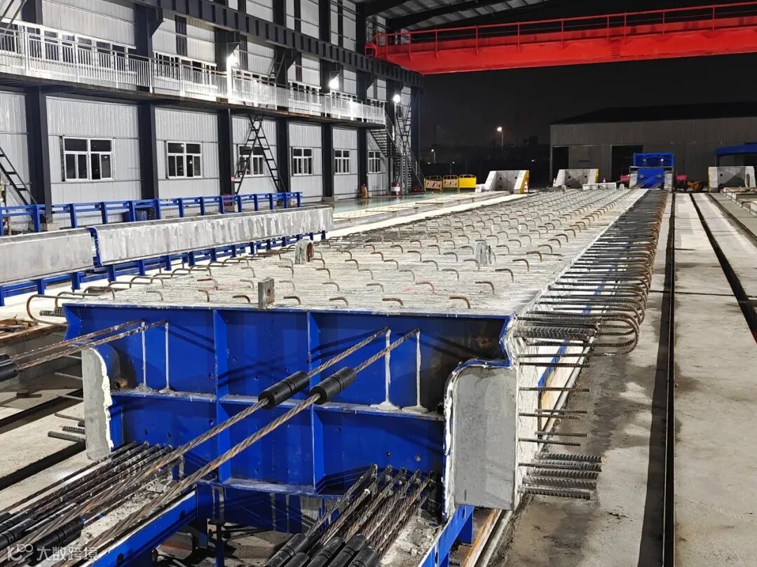 项目以智慧梁场建设为抓手,将数字孪生与智慧工地技术相结合,实现预制梁订单、钢筋加工、混凝土生产的协同管理,以及预制、存梁、运输、架设的智能控制。该座梁场占地38200平方米,设置先张法车间、后张法车间、存梁区等区域。先张法车间采用长线法生产线,