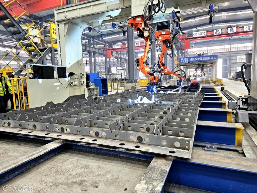 在狮子洋大桥钢壳节段生产现场,多个智能机器人忙碌地来回移动,正在对板单元进行多角度、多方位的精准焊接。在这条生产线上,配备了激光切割、智能焊接设备、分步组焊板等设备,通过全站仪配合三维软件、三维虚拟预拼装、激光扫描拟合对齐等先进技术,全面掌握各个环节质量状态,把控尺寸精度,确保了所有构件的智能化、标准化、精准化制造。