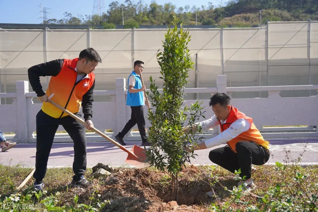 青年们个个热情洋溢、干劲十足。大家分组协作挥锹铲土、扶苗填坑,合力种下一株株树苗。另一边,广深公司萝岗中心站志愿者钟琦忙着复核检查参与者们种下的树,护航小树苗顺利成长。她说:“在植树节到来之际践行志愿初心,助推绿美广州建设,是一件很有意义的事。”