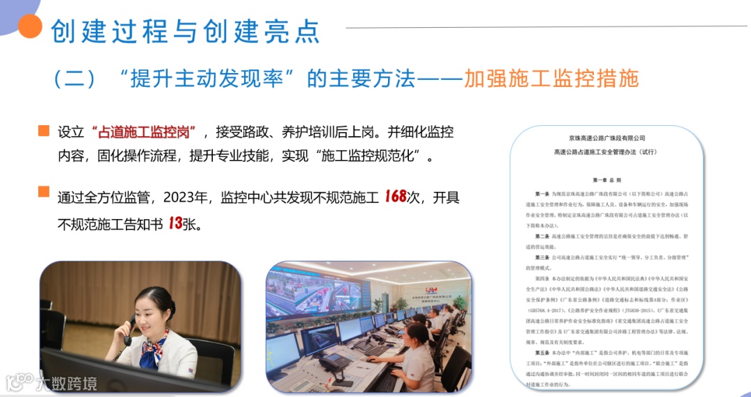 “江罗高速监控中心通过培育‘四员’监控队伍,促进‘ 三早’工作机制,不断坚持‘微创新’,推动‘五大转变’,达成‘五快成效’。建设‘安全中枢,智慧监控’,立足强化示范引领,深化‘爱·责任’品牌建设。”