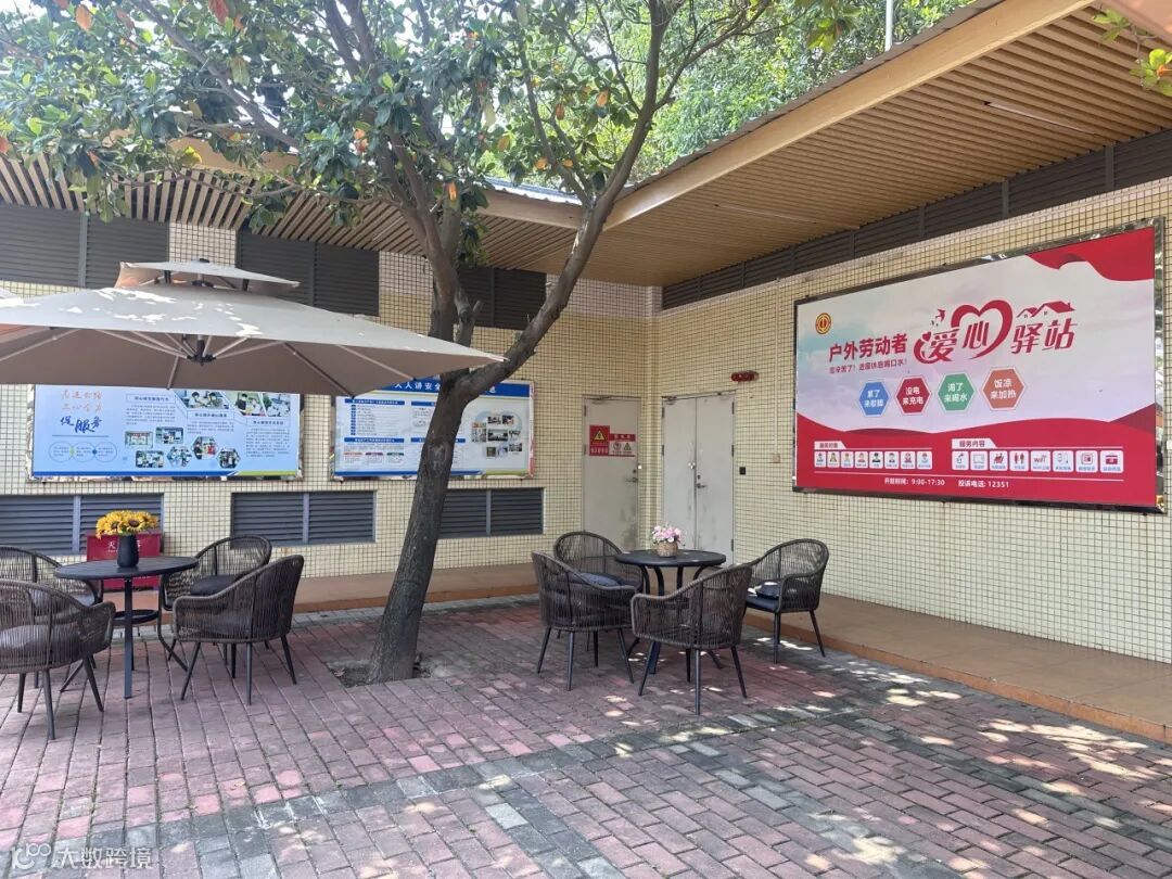 步入中山西工会爱心驿站的大门,映入眼帘的是一个约100平方米的露天休息区,宽大稳固的遮阳伞撑起一方遮阳避雨的小天地,伞下摆放着舒适的桌椅。院内还设有干净整洁的卫生间与便捷的饮水机。