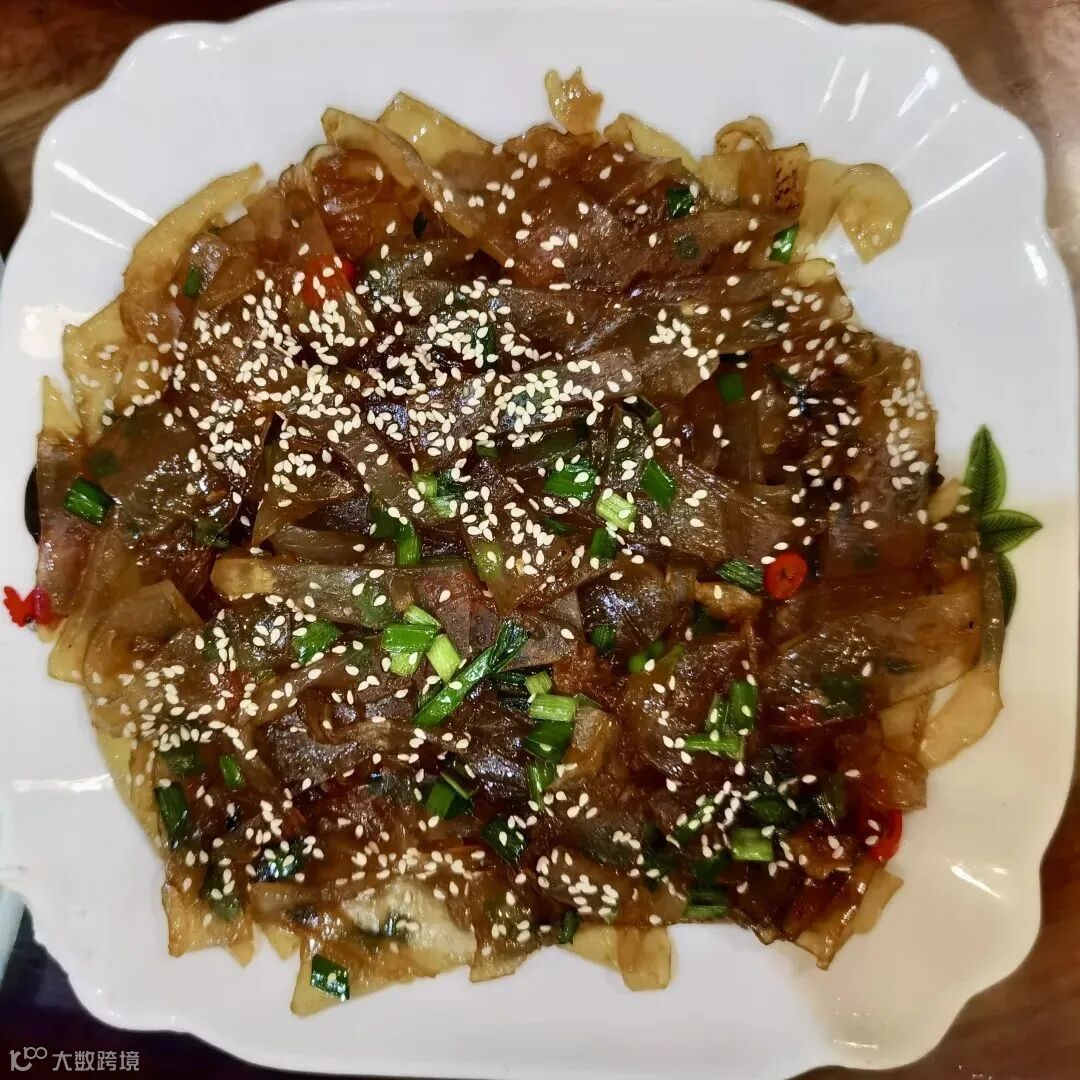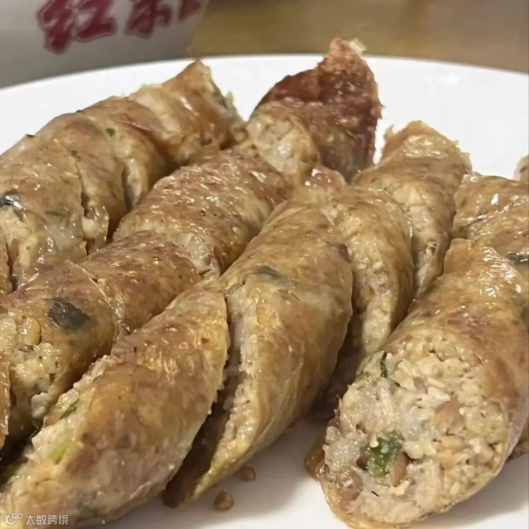 桂花肠由猪肉、虾米、花生等混成肉浆制作而成,软嫩甘鲜,层次丰富。