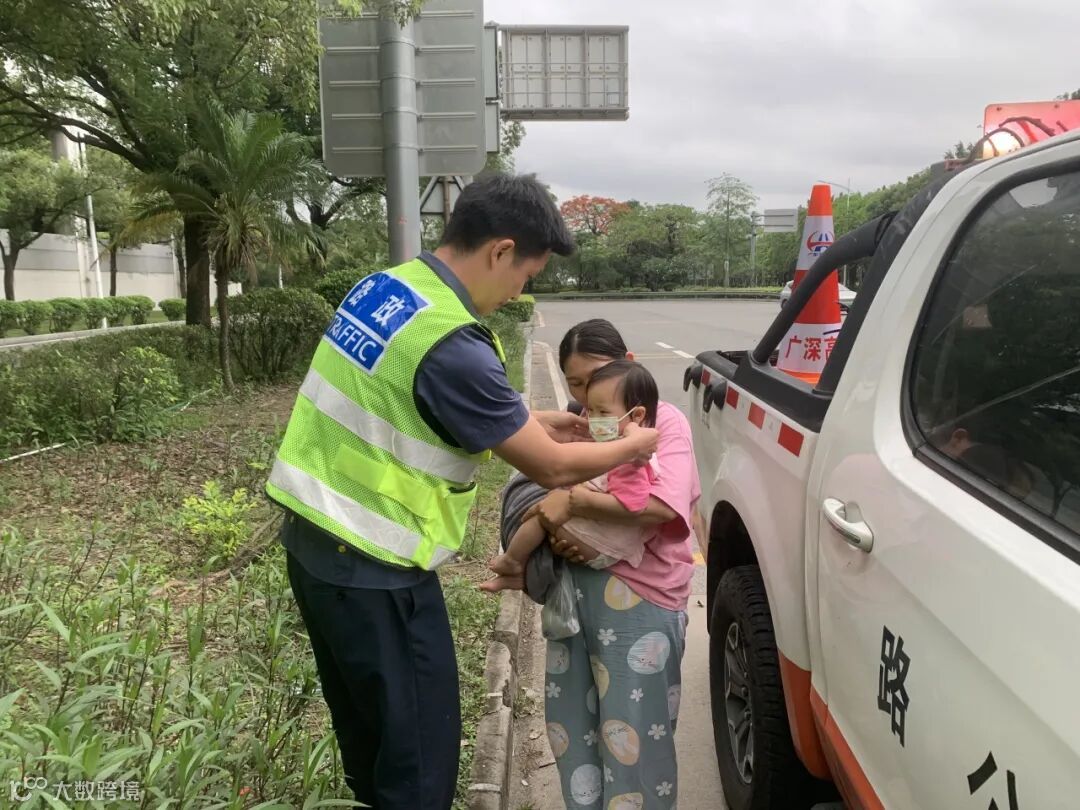 4月30日18时05分,广深高速迎来出行高峰,在长安站北入口广场,一位女士抱着小孩急匆匆地逆行进入入口广场,并向正在驻点的路政员丘建华、张涛求助。