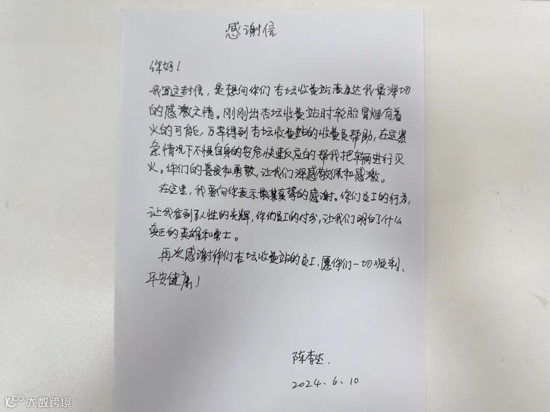 因车辆轮胎已受损,工作人员还帮助陈师傅联系修理厂人员前来维修,深受感动的陈师傅当场写下一封感谢信。