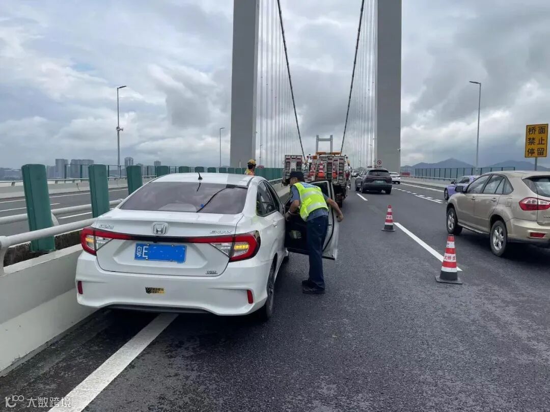 6月8日14时05分,虎门大桥监控员陈海燕巡查发现,东莞往广州方向K37+550处有三辆小车停在第一车道,还有人员在车旁走动,于是立即通知路政、拯救、交警到场处置。
