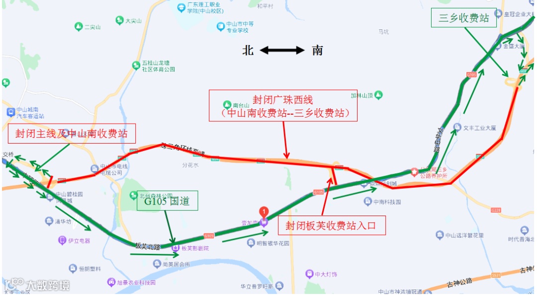 (2)封闭珠海方向主线期间,封闭中山南站、板芙站往珠海方向匝道入口。