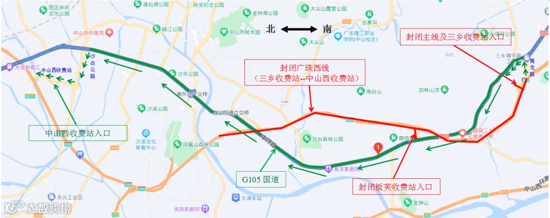 地方道路引流路线:中山南站出口—105国道—三乡站入口。