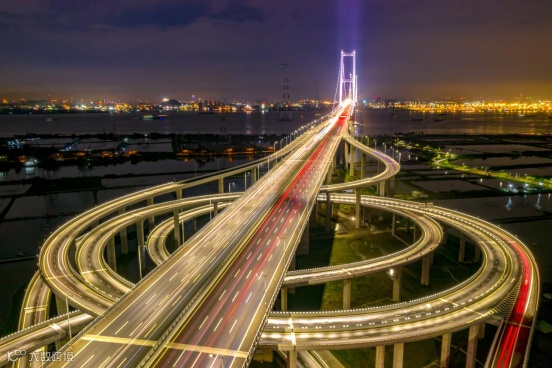 海鸥岛互通立交创新的设计为螺旋式立交,在节省用地的基础上,将螺旋形轮廓元素与悬索桥的直线、圆弧、矩形、悬链线、锥形轮廓元素相结合,大大丰富了南沙大桥的视觉元素,螺旋式互通犹如一个美丽的音符架设在海鸥岛。